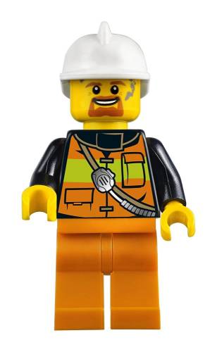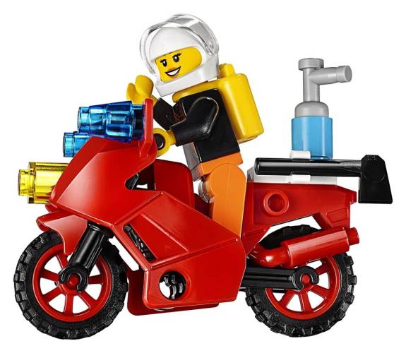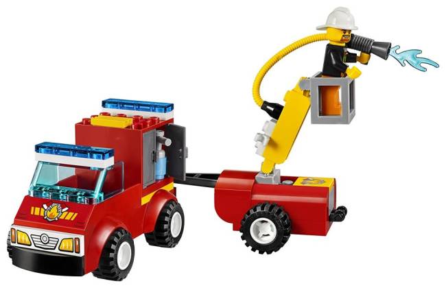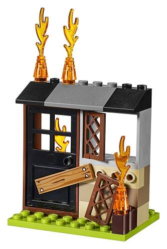 The set also includes two firefighter minifigures with acccessory elements of four translucent-orange flames and translucent-blue water, two oxygen tanks, axe, handsaw and two fire extinguishers.