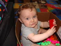 In a moment of inspiration, I came up with a fun idea for Cocoa Puff. He was crabby, having just gotten over a cold and missing several days of exploring and learning. I was playing with Froot Loop and I looked down and I saw a few storage bins with various blocks in them. I couldn’t remember the last time we had played with most of them, but Froot Loop wanted to continue playing with his cars and trains. I pulled out the storage bins and set them aside for later.