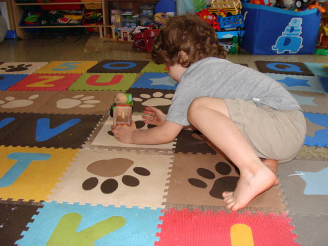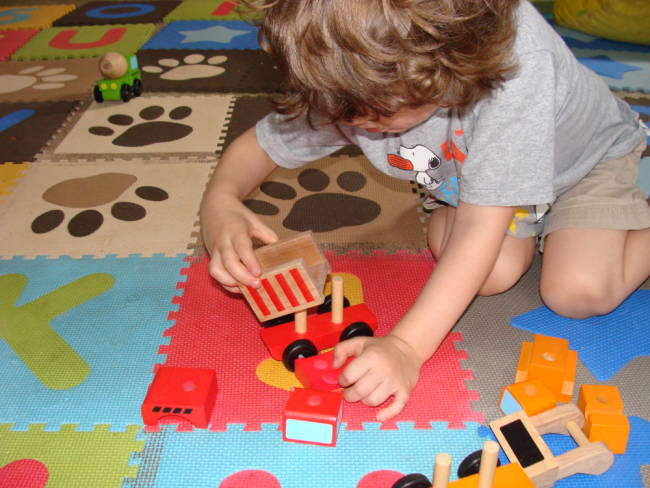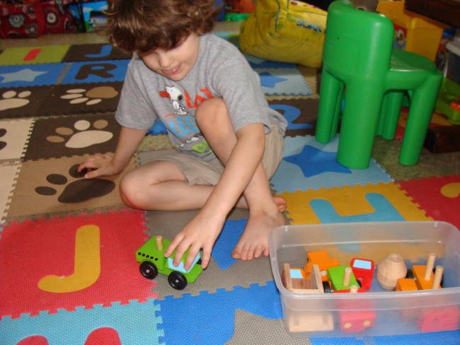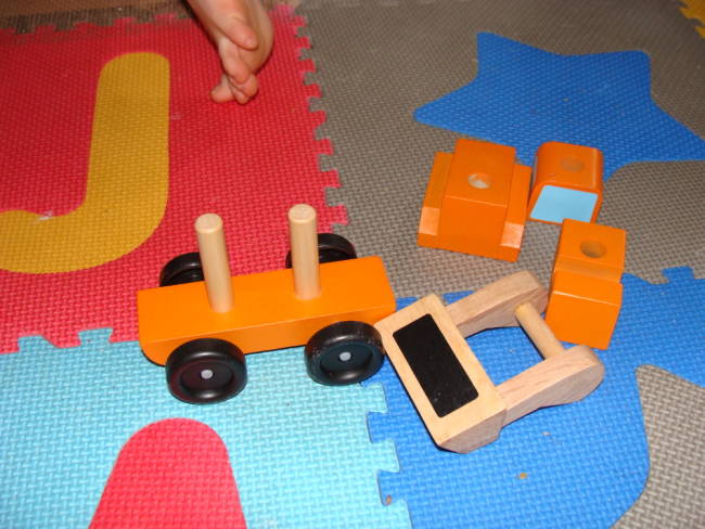 He loves putting them together correctly, driving them around, then taking them apart and making “silly cars” where he mixes and matches the different parts of the trucks to make interesting combinations.