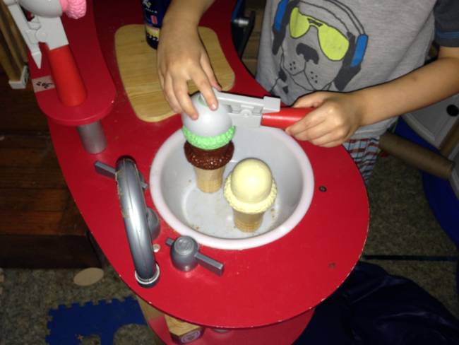 Overall, we love, love, love this ice cream set. My only complaint is that the magnets could be a tad bit stronger to hold up to little hands. They do stick to each other, but it doesn’t take much to knock it off of the scooper or the cone.