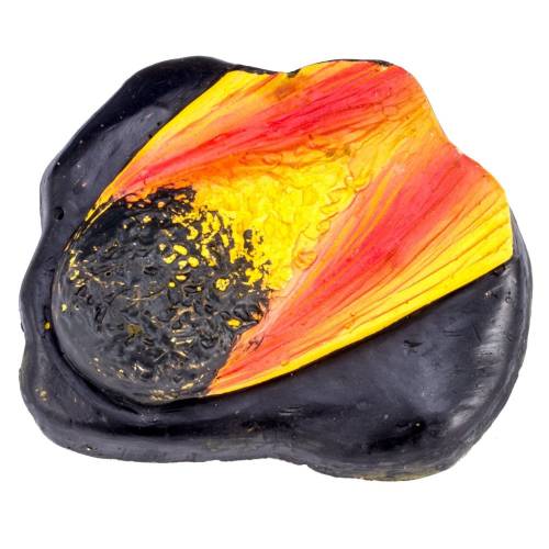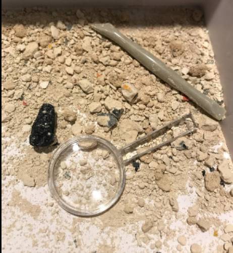The kit comes with a plaster block with a meteorite and a tektite buried in it. There is also a small brush, a small double sided chisel, and a small magnifying glass, which is practically useless. The chisel is plastic and pretty flimsy. One side is angled and the other is straight. It takes a lot of effort to use it efficiently on the block. The areas with the orange and yellow paint were especially difficult to work on. We fixed this problem by turning the block over and chiseling from the bottom. This made it go faster and I recommend it unless you want your hands to be covered in blisters.