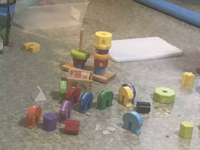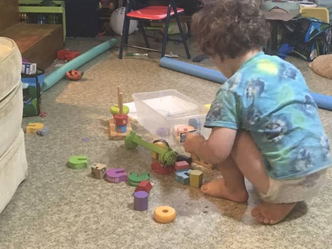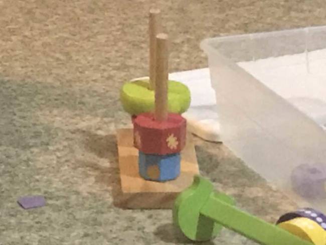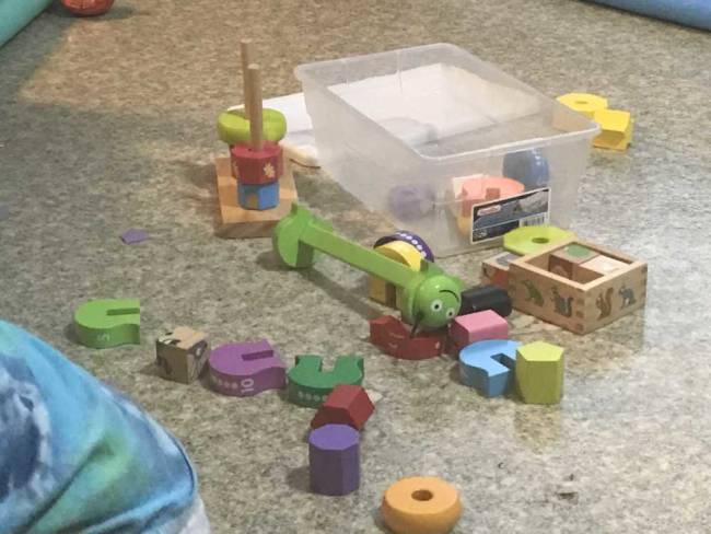 Cocoa Puff likes to get out this stacking toy, his counting caterpillar, and some other puzzles at the same time.