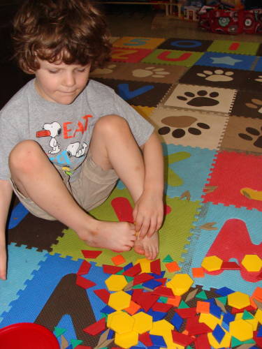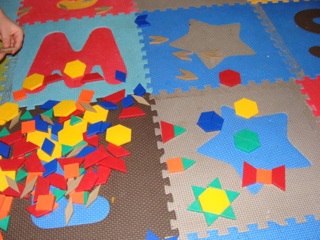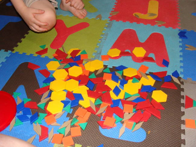 I have had these pattern blocks sitting around for over a year because Froot Loop just never seemed ready enough to use them. recently, I remembered I had them and pulled them out since Froot Loop seemed to be in a constructive and learning mood.