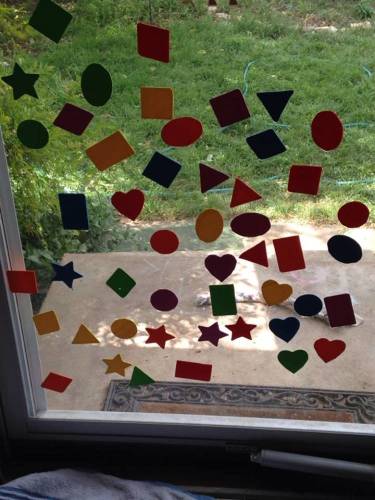 One day, I thought I'd try to see if they stuck on our glass screen door, and of course, they did, which was a lot of fun! I gave the boys a small bowl with a little water and told them to dip the foam shapes into the water and then stick them on the window. They had a lot of giggles and a lot of fun!