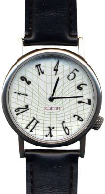 This relativity watch is a thing of beauty. Instead of the hands moving around, the hands stay stationary and the background moves around instead! I also appreciate the addition of i for 1, pi for 3, and x for 10. Very clever.