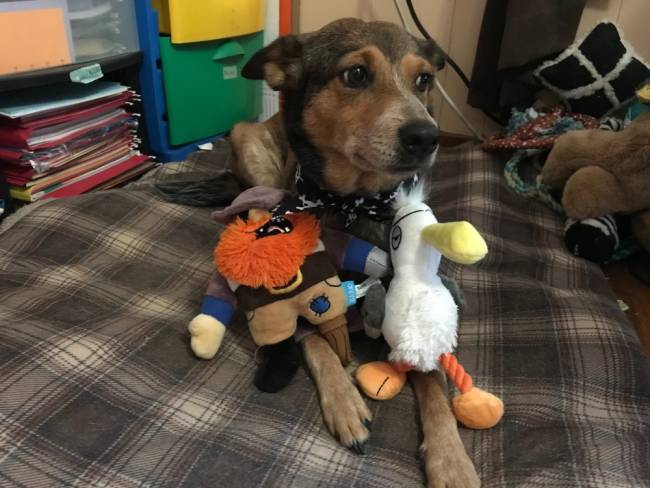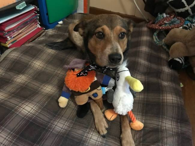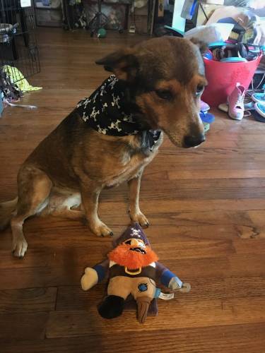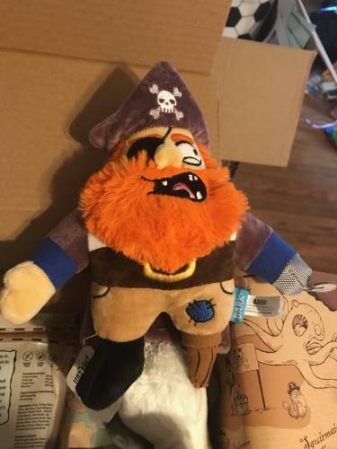 Onward t' th' toys! First was a pirate squeaky chew toy.