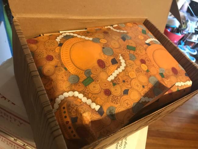 I could tell 'twas pirate themed 'cause th' whole box looked like a booty chest. This made us even more excited t' open it.
