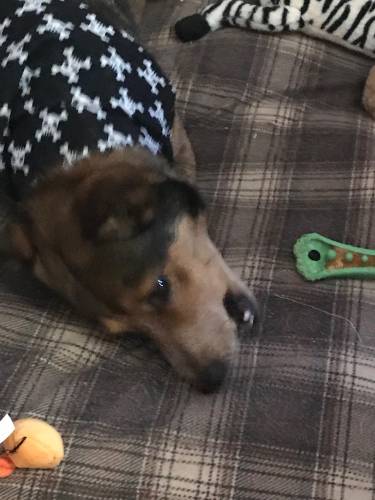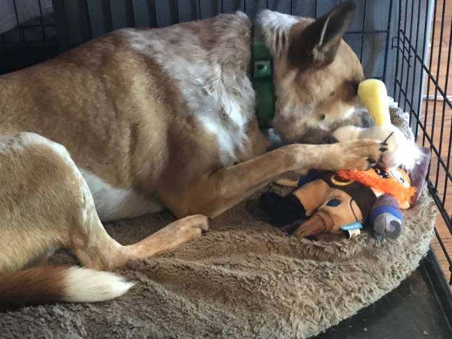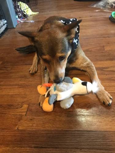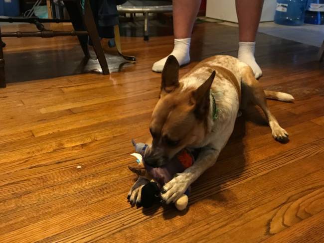 Fruity Pebbles immediately tried t' destroy it, but 'tis nice 'n strong 'n held up t' her shenanigans. She loves t' brin' it into her kennel 'n chew on it 'n snuggle wit' it.