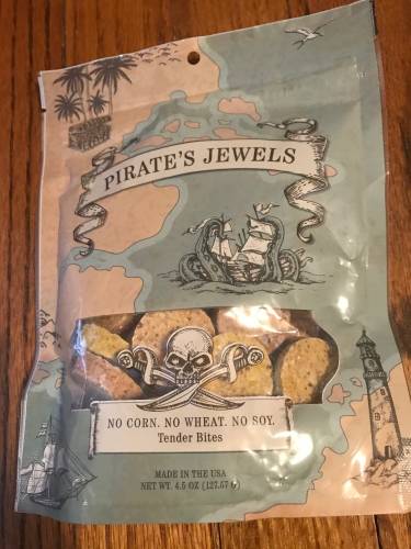 Th' first o' th' two varieties o' treats in th' box were Pirate's Jewels. They be crunchy.