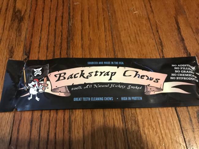 However, she was VERY interested in th' next item I pulled out... 'twas a Backstrap Chew!