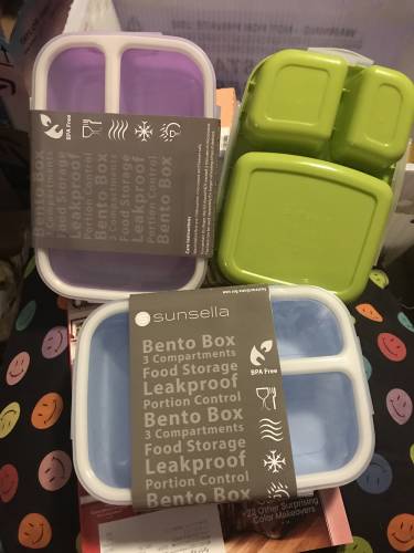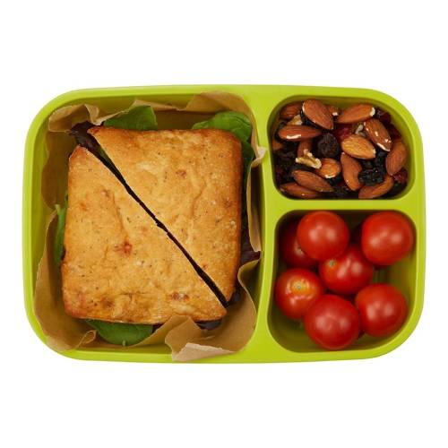 Honey Graham and I also use them when we take our lunches on the go. The bento boxes have 3 compartments, perfect for salads, snacks, dip, veggies, sammiches, fruits, and more!