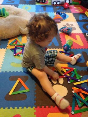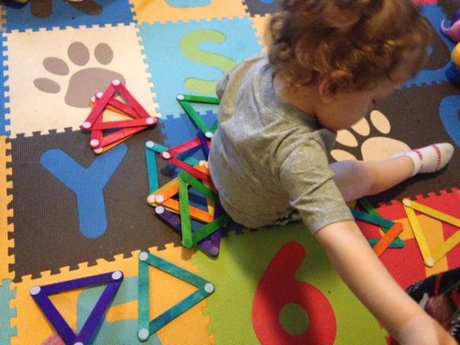 We like to make shapes and letters and numbers with our velcro sticks. We also like to work on patterns and sorting. The possibilities are endless! One of the things we used to do is sort all the sticks by color and make triangles or squares out of them. We also would do mixing colors, like a red and a blue stick, and I'd ask which stick completes it.