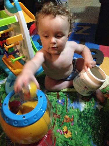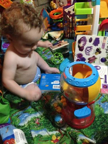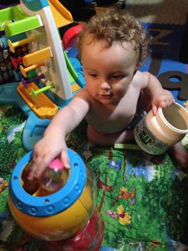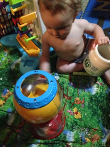 Froot Loop liked it too, but he was more methodological about it. He was on a mission to get the four balls out and then back in. With Cocoa Puff, we race to see if I can put the balls in quicker than he can get them out. We both laugh a lot.