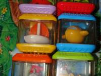 Fisher Price has made a line of Peek-a-Blocks. We have the vehicle set of blocks and the tumblin’ sounds giraffe. There are other sets to go with these, but we have enough! I’ve picked up several single blocks at thrift stores over the years and they work with the giraffe perfectly.