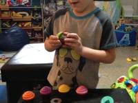 Froot Loop found a set of play cupcakes at my parents’ house that I had as a kid. It’s a set of 4 cupcakes with 4 different colored frosting tops. There’s also a cute tray that the cupcakes sit in. Basically, all you do is put the different cupcake tops on the cupcakes and put them in and take them out of the cupcake tray, but it was one of my favorite things to play with and now it’s his too!