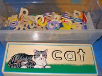 Right before he turned three last fall, Froot Loop really started getting interested in spelling and reading. I bought some letter construction sets (see post here). I also bought some spelling games such as Boggle Junior (see post here), Spill and Spell (I found a vintage version at a garage sale! - it’s this one!), and bananagrams (see post HERE).
